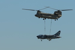 An A-7D Corsair II fighter jet of the Iowa Air National Guard was transported via airlift from the 185th Air Refueling Wing by a Ch-47 Chinook helicopter of Bravo Company, 171st Aviation Regiment to be displayed at Siouxland Freedom Park in South Sioux City, Iowa, Sept. 16, 2025.