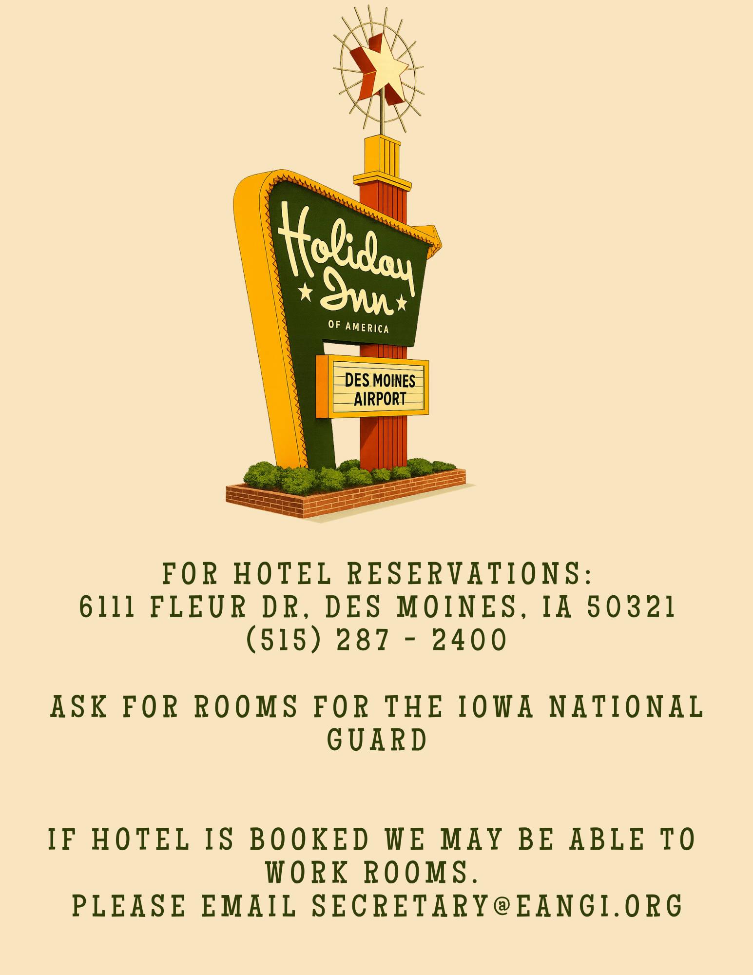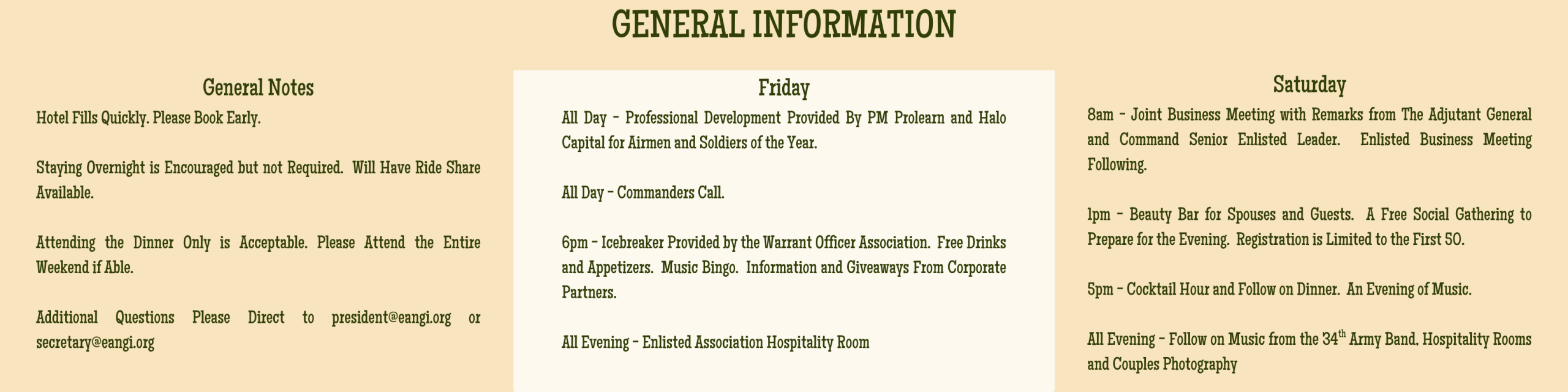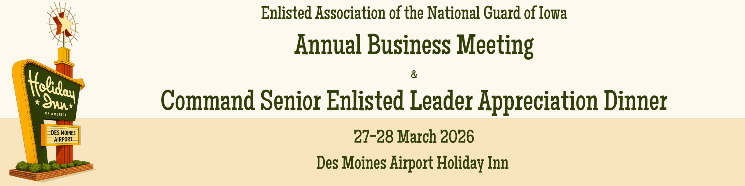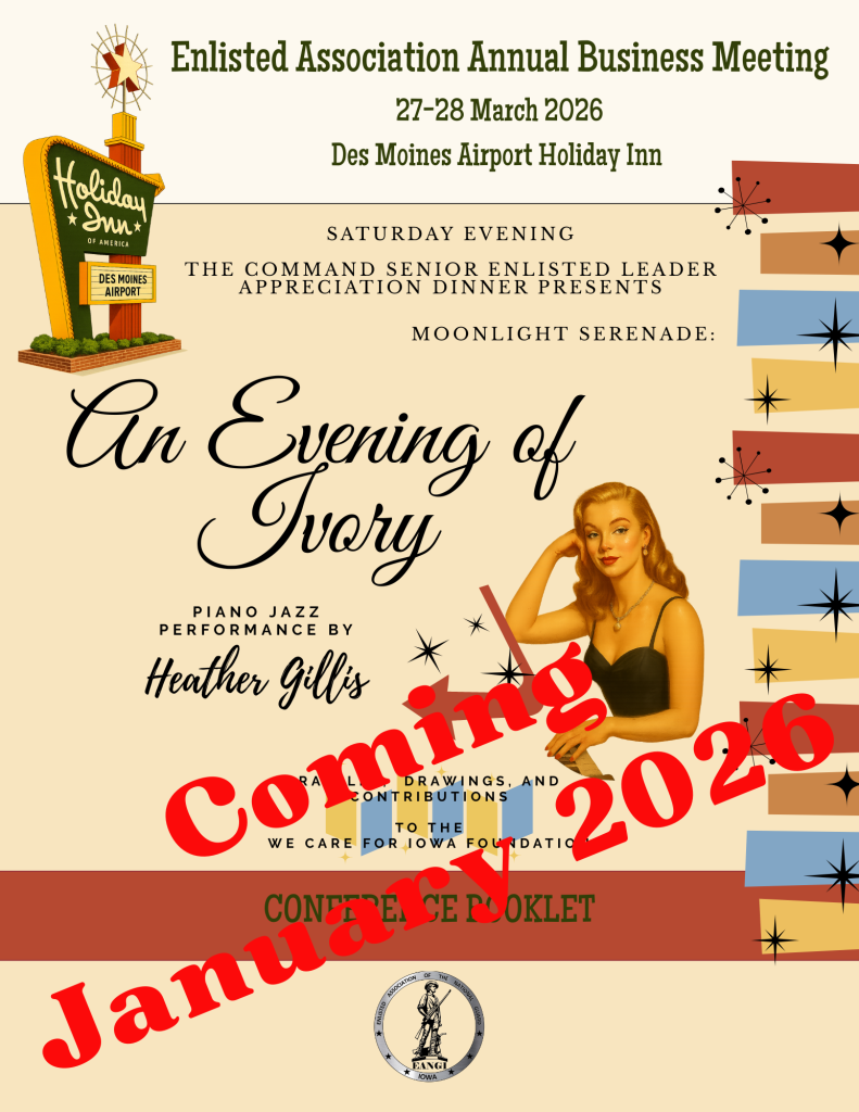 HOTEL INFORMATION CONFERENCE BOOKLET Download January 2026 BEAUTY BAR INFORMATION Register Here! Registration TypePlease select one option from belowAre you:(Required) Attendee Sponsoring an Attendee Invited Dintinguished Visitor/Speaker Select "Attendee" for normal registration - Select "Sponsoring an Attendee" if you are purchasing a registration for an attendee.Sponsor InformationSponsor Name(Required) First Last Sponsor Email(Required) Enter Email Confirm Email Conference Attendee InformationAttendee Name(Required) First Last Email(Required) Enter Email Confirm Email Phone(Required)Home Address(Required) Street Address City AlabamaAlaskaAmerican SamoaArizonaArkansasArmed Forces AmericasArmed Forces EuropeArmed Forces PacificCaliforniaColoradoConnecticutDelawareDistrict of ColumbiaFloridaGeorgiaGuamHawaiiIdahoIllinoisIndianaIowaKansasKentuckyLouisianaMaineMarylandMassachusettsMichiganMinnesotaMississippiMissouriMontanaNebraskaNevadaNew HampshireNew JerseyNew MexicoNew YorkNorth CarolinaNorth DakotaNorthern Mariana IslandsOhioOklahomaOregonPennsylvaniaPuerto RicoRhode IslandSouth CarolinaSouth DakotaTennesseeTexasU.S. Virgin IslandsUS Virgin IslandsUtahVermontVirginiaWashingtonWest VirginiaWisconsinWyoming State ZIP Code Rank(Required)N/AE1 (AB / PV1)E2 (AMN / PV2)E3 (A1C / PFC)E4 (SrA / SPC or CPL)E5 (SSgt / SGT)E6 (TSgt / SSG)E7 (MSgt / SFC)E8 (SMSgt / MSG or 1SG)E9 (CCMSgt / CSM / CMSgt / SGM)Retirees select the rank at time of retirement.Military Status(Required)Active Guard / Reserve (AGR)Military TechnicianTraditional Guard MemberActive DutyCivilianRetiredRetiredBranch(Required)ArmyAirN/AUnitBanquet InformationWill Spouse/Guest Be Attending?(Required)YesNoSpouse/Guest Name(Required) First Last Saturday Evening Attendee Meal Choice(Required)Sous Vide Sirloin SteakTuscan ChickenEggplant Fettuccine (Vegetarian)Spouse/Guest Saturday Evening Meal Choice(Required)Sous Vide Sirloin SteakTuscan ChickenEggplant Fettuccine (Vegetarian)Payment Information2026 State Conference Registration(Required) Junior Enlisted (E1-E6) Registration Senior Enlisted (E7-E9) Registration Includes conference registration and dinner. Room reservations must be made on your own. 2026 State Conference Registration w/ Guest(Required) Junior Enlisted (E1-E6) Registration w/ Guest Senior Enlisted (E7-E9) Registration w/ Guest Includes conference registration and dinner. Room reservations must be made on your own. Would you like to help sponsor a Junior Enlisted members registration? Yes - $55.00 Sponsor Junior Enlisted Coupon What do you plan to attend? Friday Evening Icebreaker (March 27) Daytime Business Activities (March 28) Appreciation Dinner (March 28) Select AllCheck multiple if applicableTotal Credit CardCard Details Cardholder Name